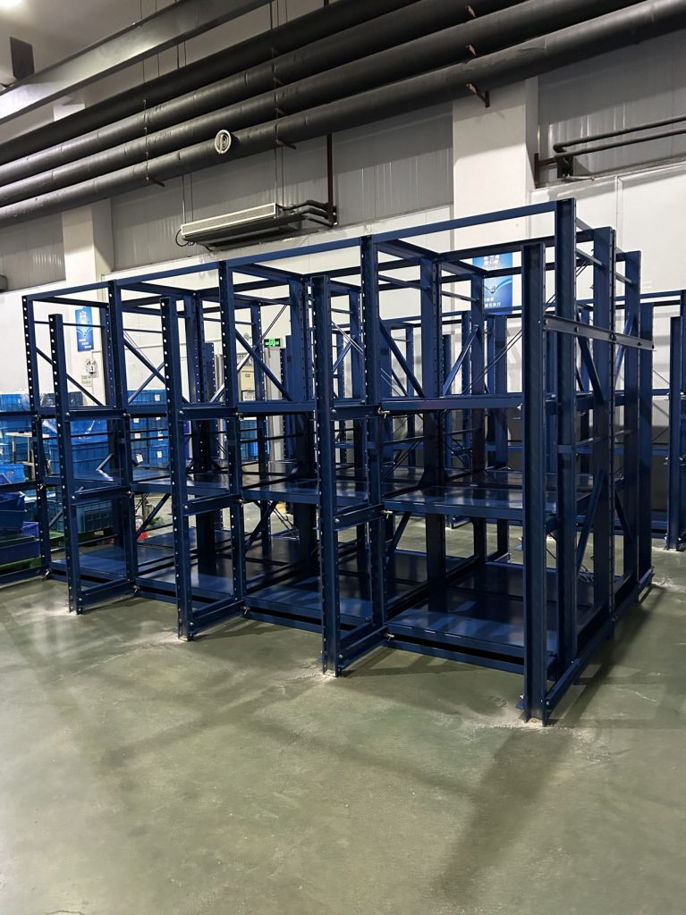 全抽模具架靠墻,配合行車,存取模具的時候把抽屜抽出,吊裝好以后再吧抽屜推進去,