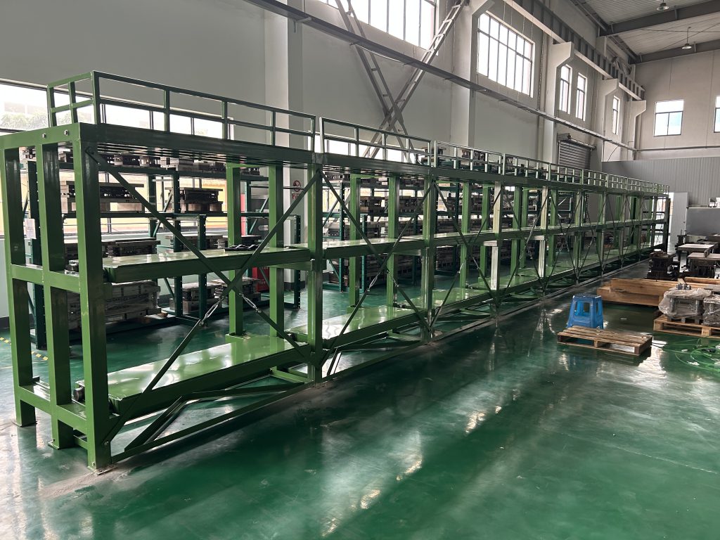 2023年4月12日江蘇海安客戶手搖模具架安裝現場,貨架整體需用RAL6010顏色,頂部安裝防護欄;